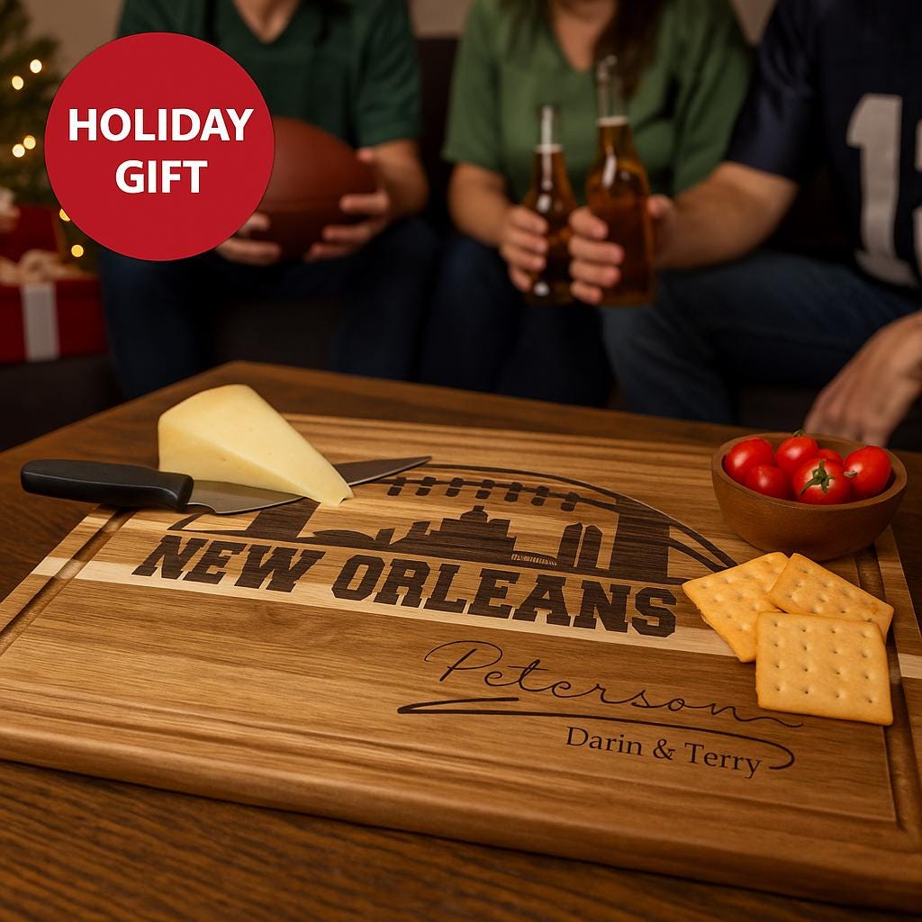 Each board is laser-engraved with a bold New Orleans football skyline design and personalized with your family name, date, or custom message. The natural wood grain of each acacia board ensures that every piece is truly unique.