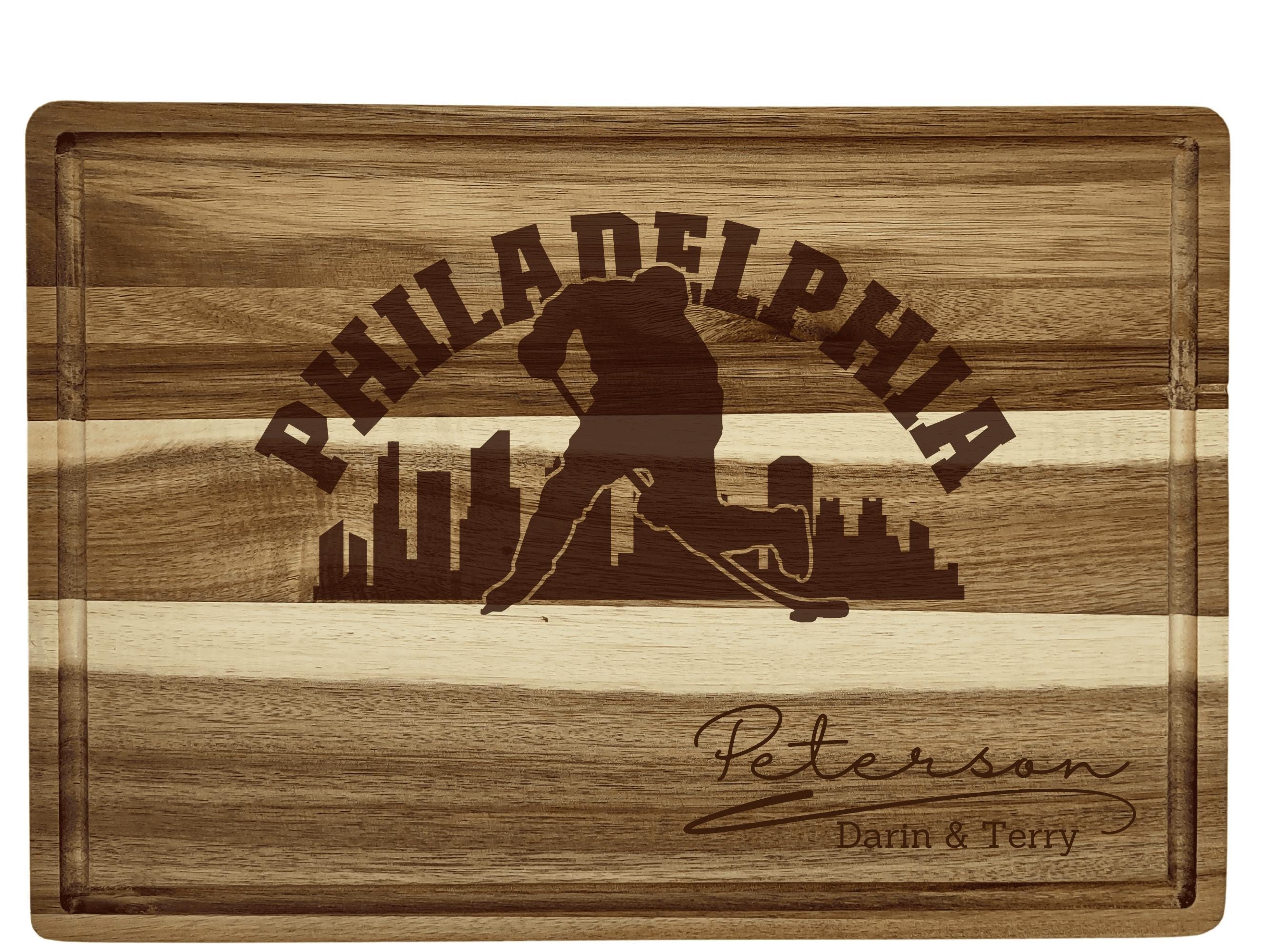 Looking for a thoughtful and unique gift for the Philadelphia Hockey fan in your life? How about that perfect accessory for your hockey party? Our custom cutting boards are the perfect choice! Crafted from sustainable acacia wood, these cutting boards add a touch of elegance to any kitchen. Personalized with precision using our laser engraving process, they make a memorable and functional gift for various occasions.
