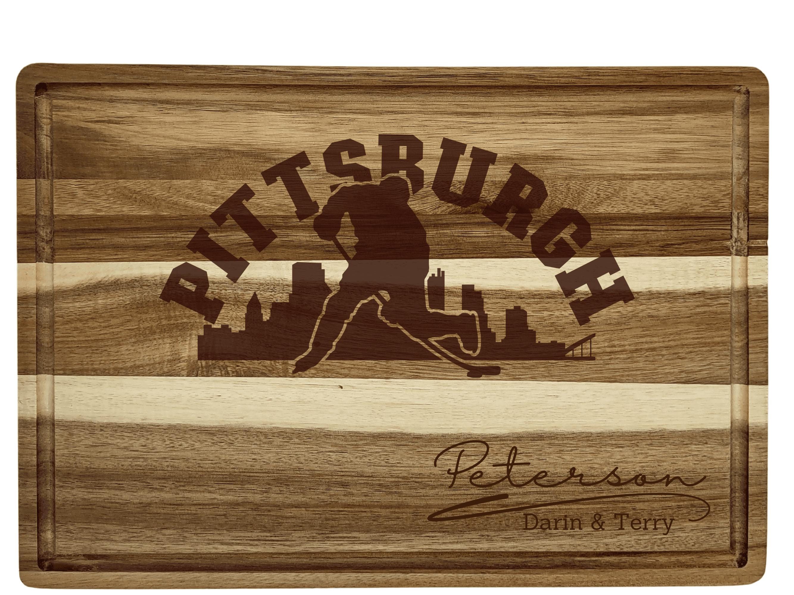Looking for a thoughtful and unique gift for the Pittsburgh Hockey fan in your life? How about that perfect accessory for your hockey party? Our custom cutting boards are the perfect choice! Crafted from sustainable acacia wood, these cutting boards add a touch of elegance to any kitchen. Personalized with precision using our laser engraving process, they make a memorable and functional gift for various occasions.
