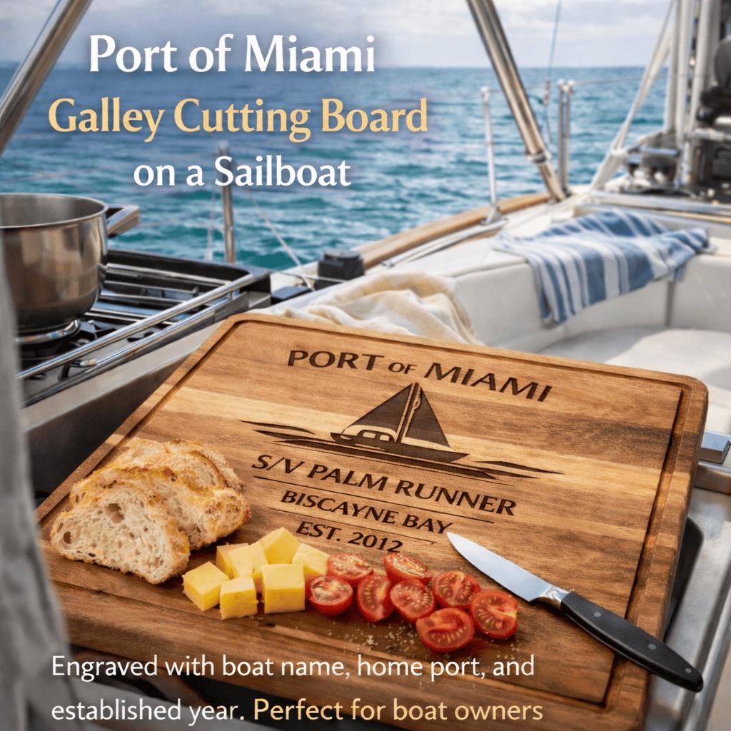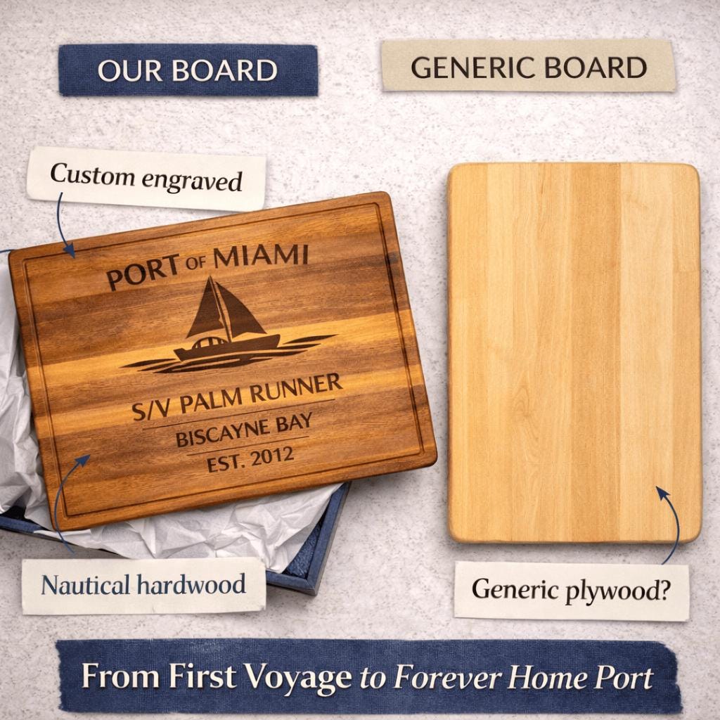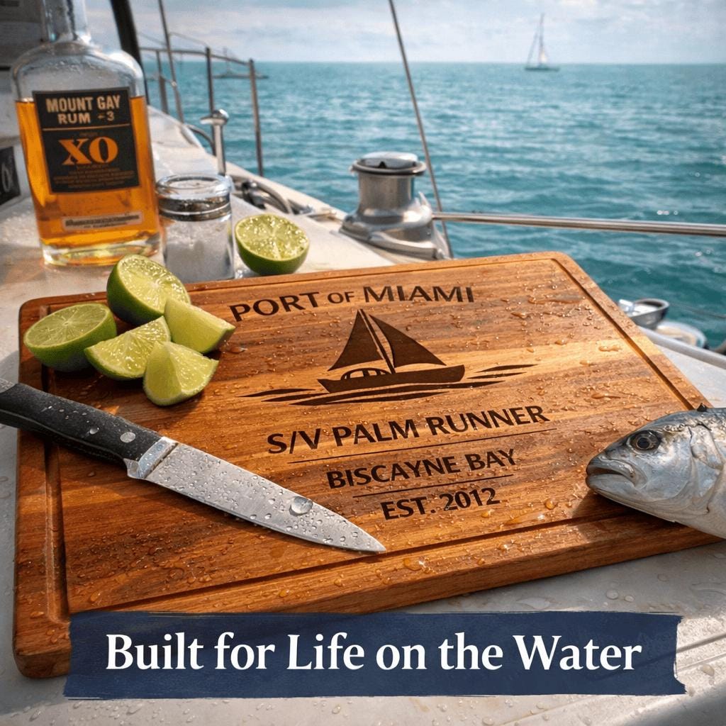 Bring the spirit of the sea into your galley with a personalized sailboat cutting board engraved with your boat name, home port, and established year. Designed for sailors, yacht owners, and ocean lovers, this premium acacia wood board is both a functional galley essential and a meaningful keepsake.