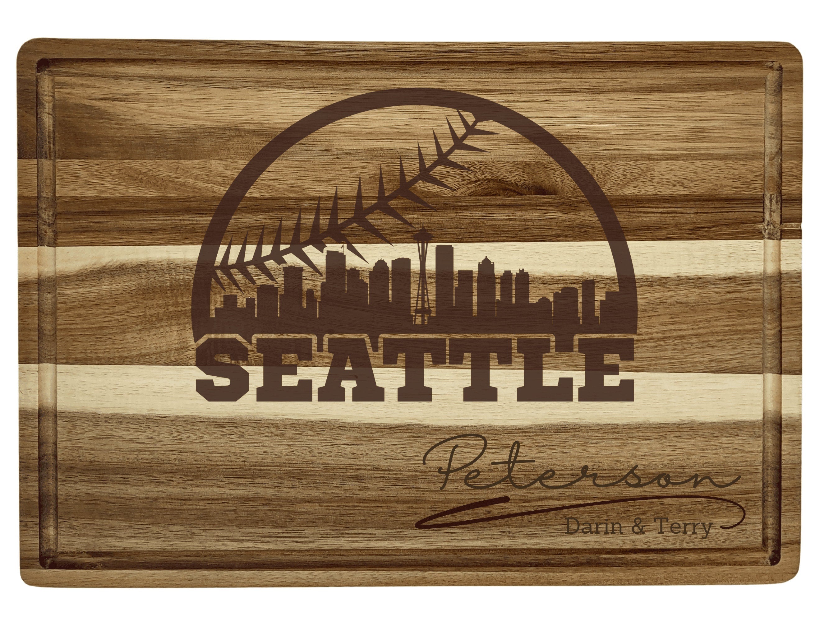 Elevate your kitchen or gift-giving with our Custom Seattle Baseball Cutting Board. Featuring a laser-engraved Seattle skyline and baseball stitching design, this acacia wood board makes a perfect keepsake for sports fans, food lovers, and new homeowners.