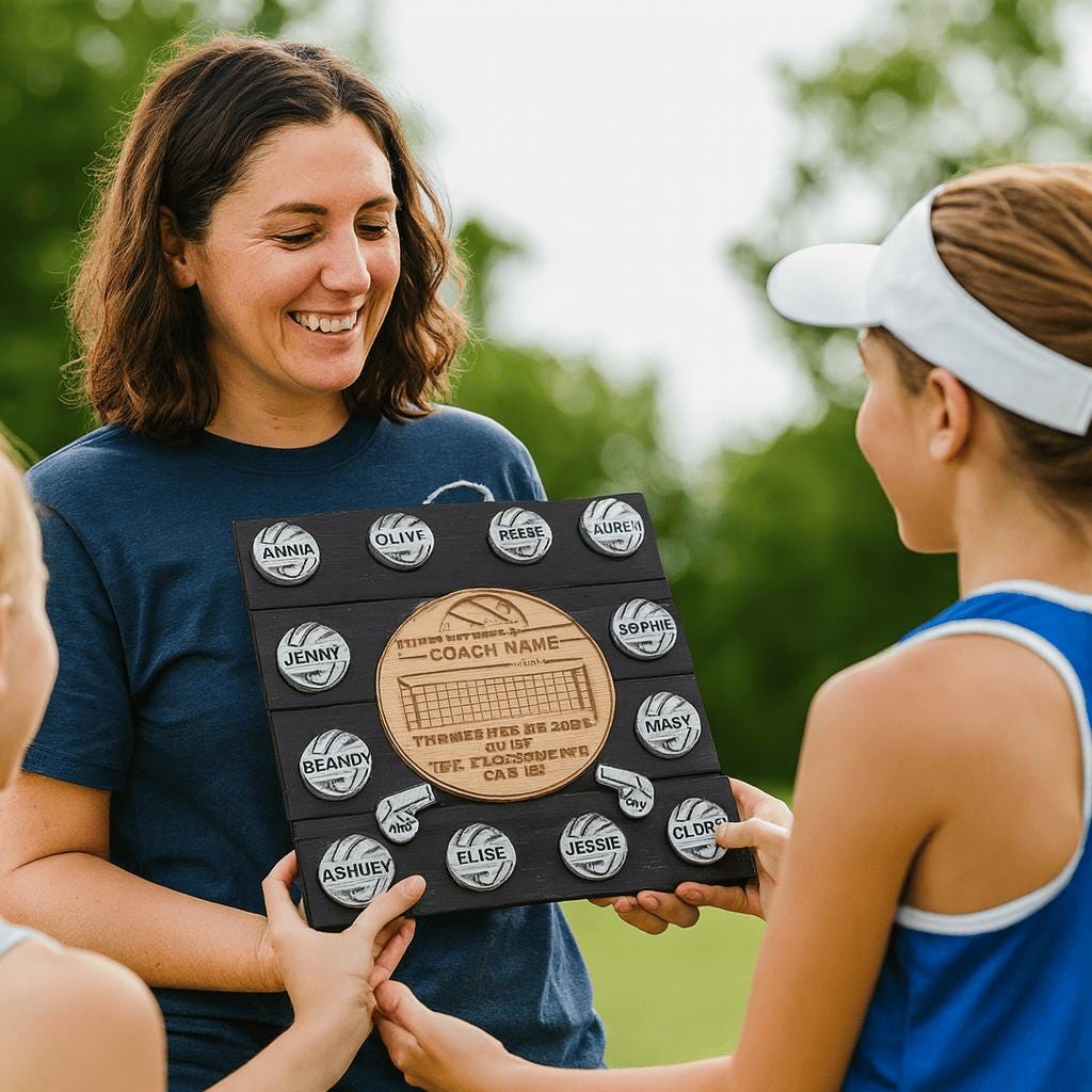 Each plaque is designed with care, featuring laser-cut volleyballs customized with player names and numbers. The center court area is engraved with your coach’s name, team name, and season year, making it a truly one-of-a-kind gift.