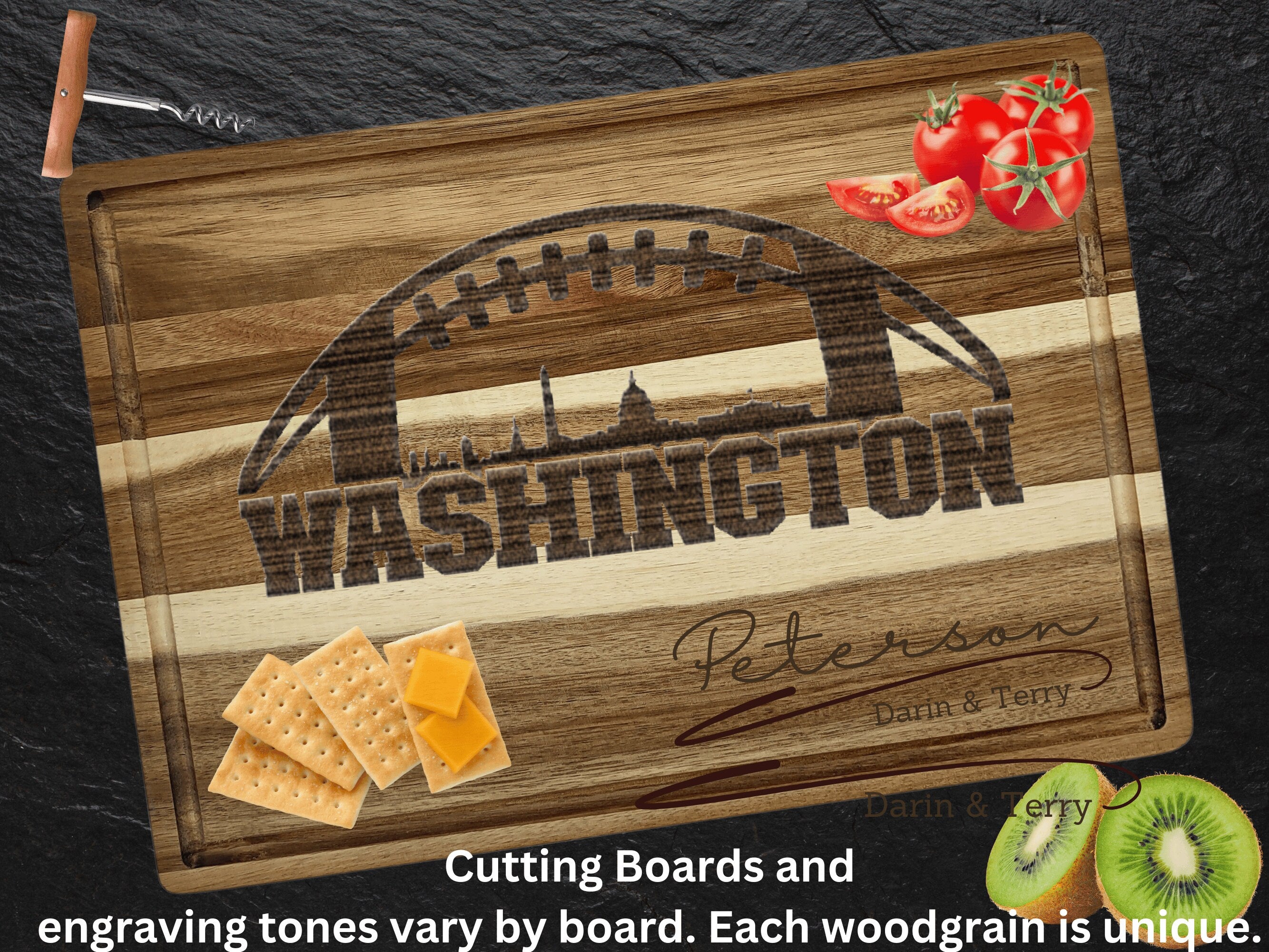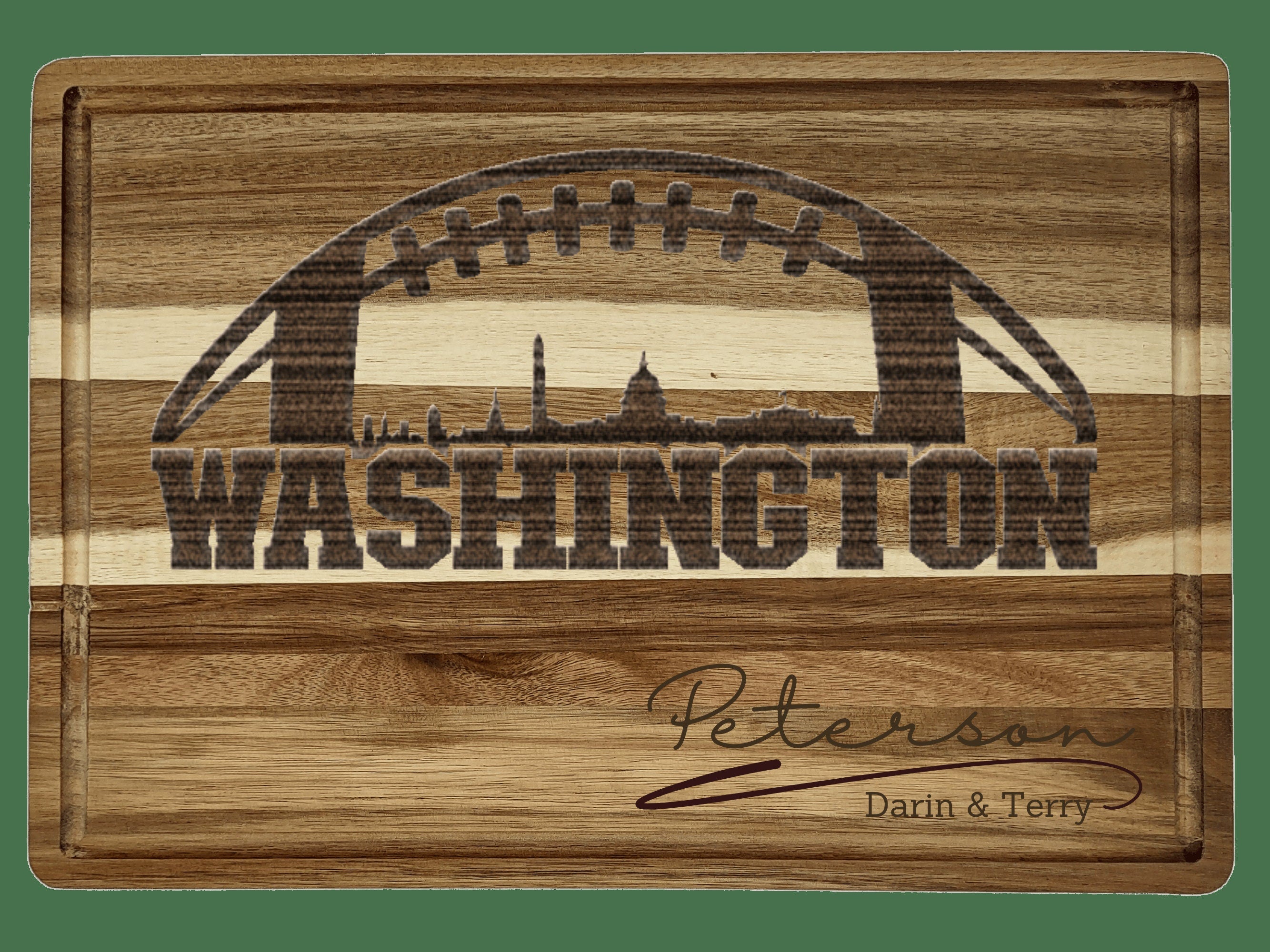 Looking for a thoughtful and unique gift for the Washington football fan in your life? How about that perfect accessory for your Super Bowl party? Our custom cutting boards are the perfect choice! Crafted from sustainable acacia wood, these cutting boards add a touch of elegance to any kitchen. Personalized with precision using our laser engraving process, they make a memorable and functional gift for various occasions.