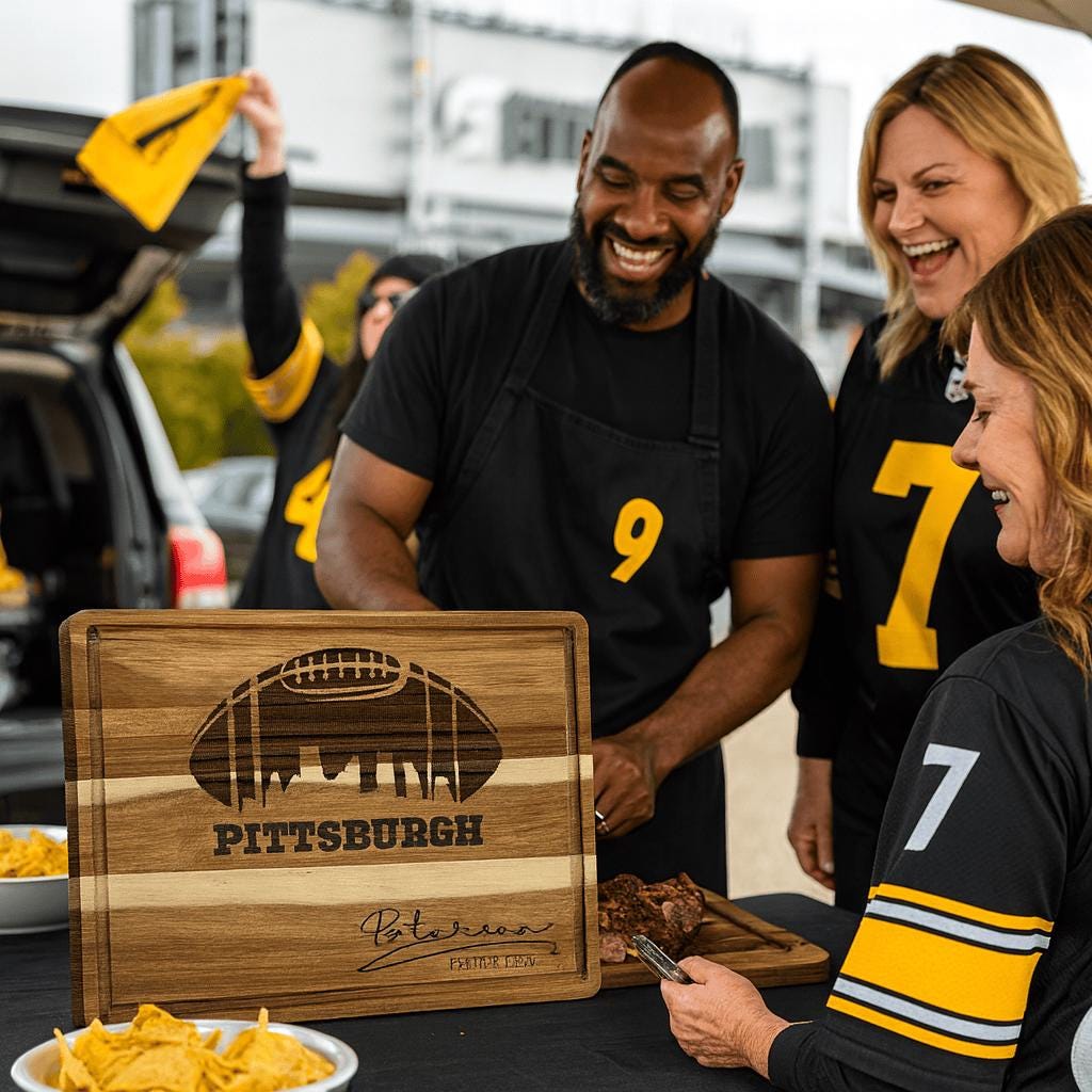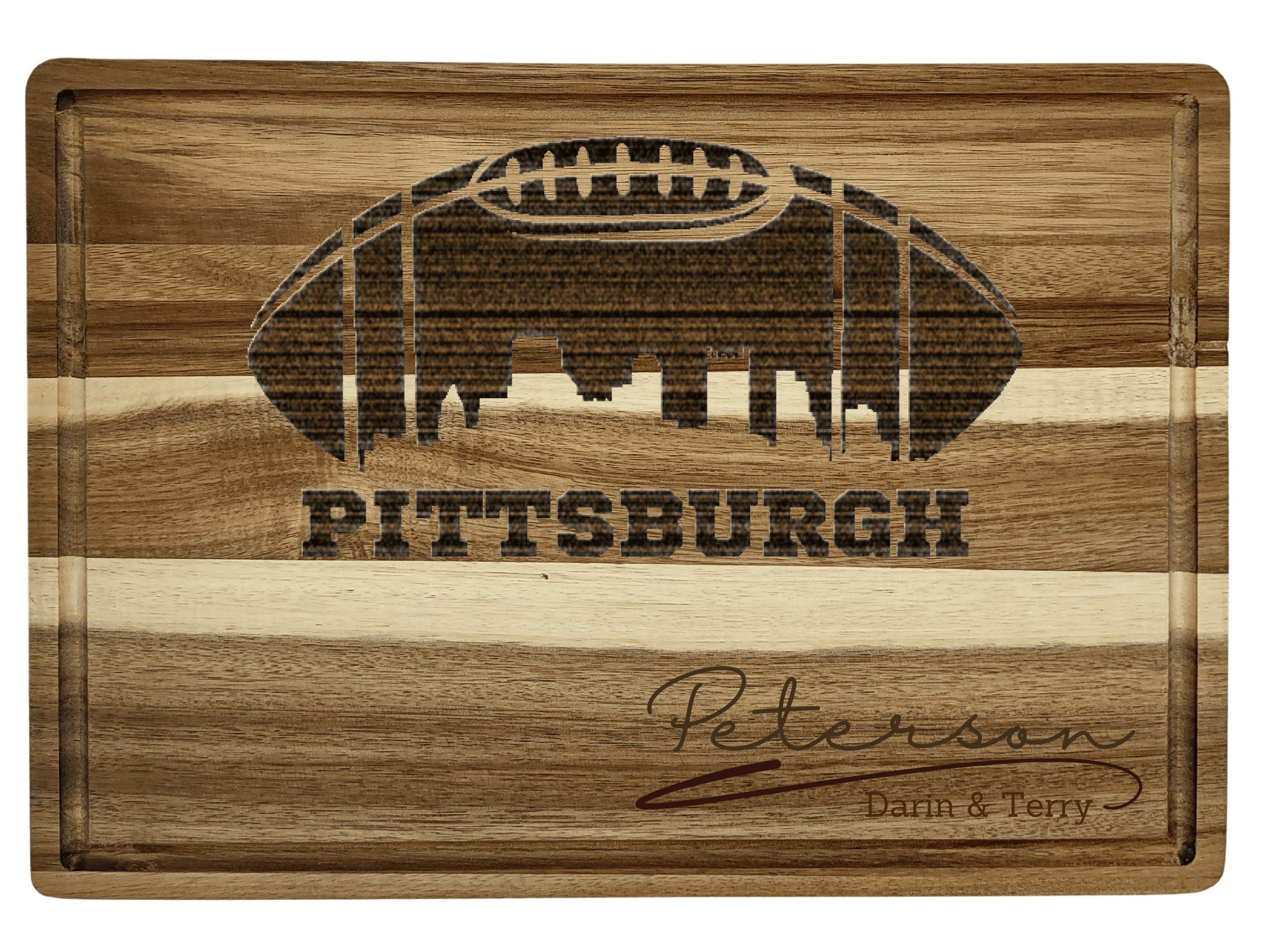 Looking for a thoughtful and unique gift for the Pittsburgh football fan in your life? How about that perfect accessory for your Super Bowl party? Our custom cutting boards are the perfect choice! Crafted from sustainable acacia wood, these cutting boards add a touch of elegance to any kitchen. Personalized with precision using our laser engraving process, they make a memorable and functional gift for various occasions.