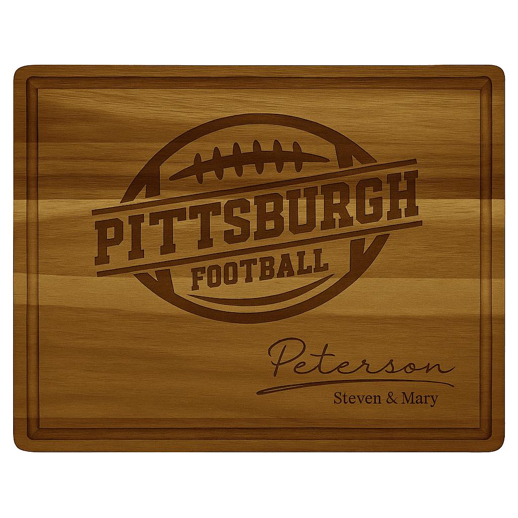 Bring your Pittsburgh football pride into the kitchen or tailgate with this custom engraved acacia wood cutting board! Perfect for fans who love game days, parties, and entertaining, this durable board doubles as a functional prep surface and an eye-catching serving piece. Personalize it with your family name or a custom message for a one-of-a-kind gift that celebrates both style and team spirit.