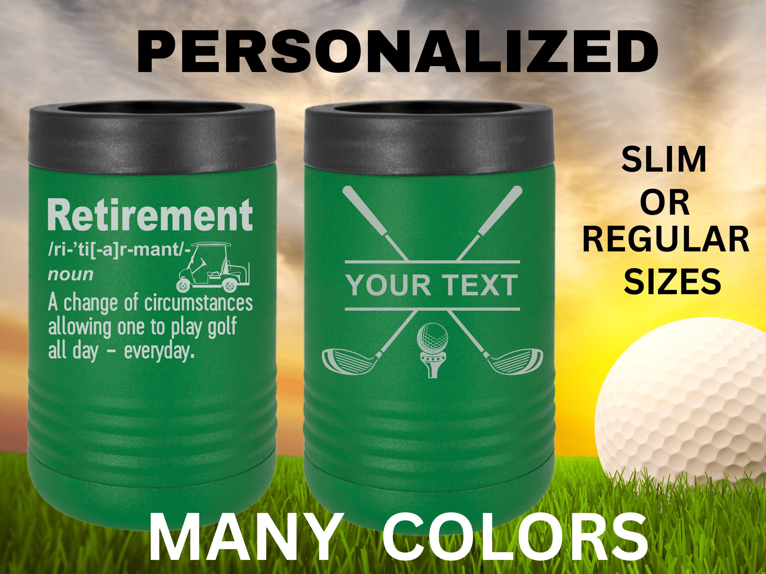 - Unique Laser Engraving: Show off your love for golf with our exclusive "Retirement - a change of circumstances allowing one to play golf all day, every day" engraving. The reverse side features a set of golf clubs and includes a personalized area. All engravings are silver (chrome), adding a touch of elegance to your can cooler.