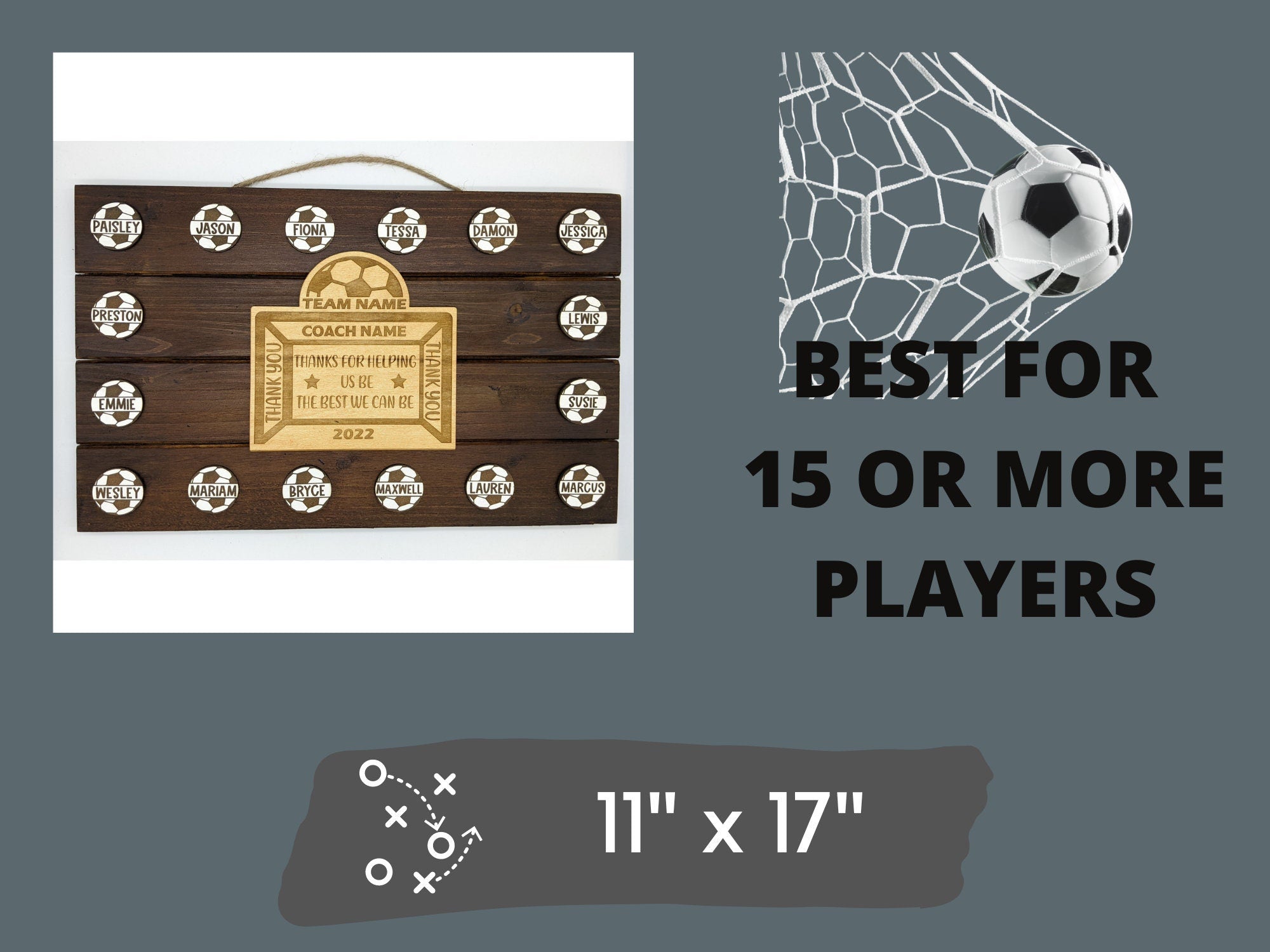 Custom Soccer-Themed Design: This wooden plaque showcases intricately laser-cut soccer balls, each personalized with a player's name and number, if desired. The wooden goal area is skillfully engraved with the coach's name, team name, season, and a heartfelt thank you message.