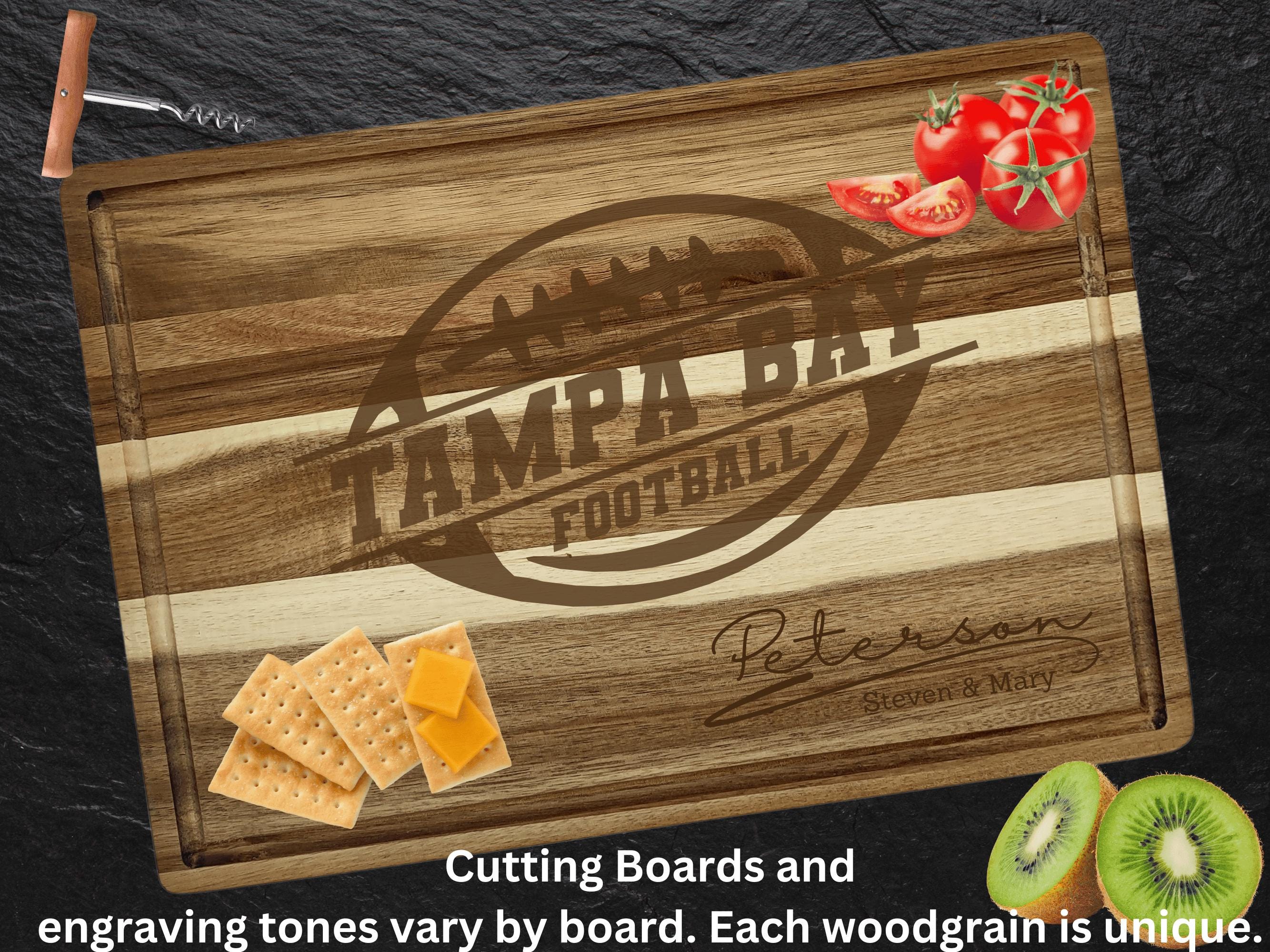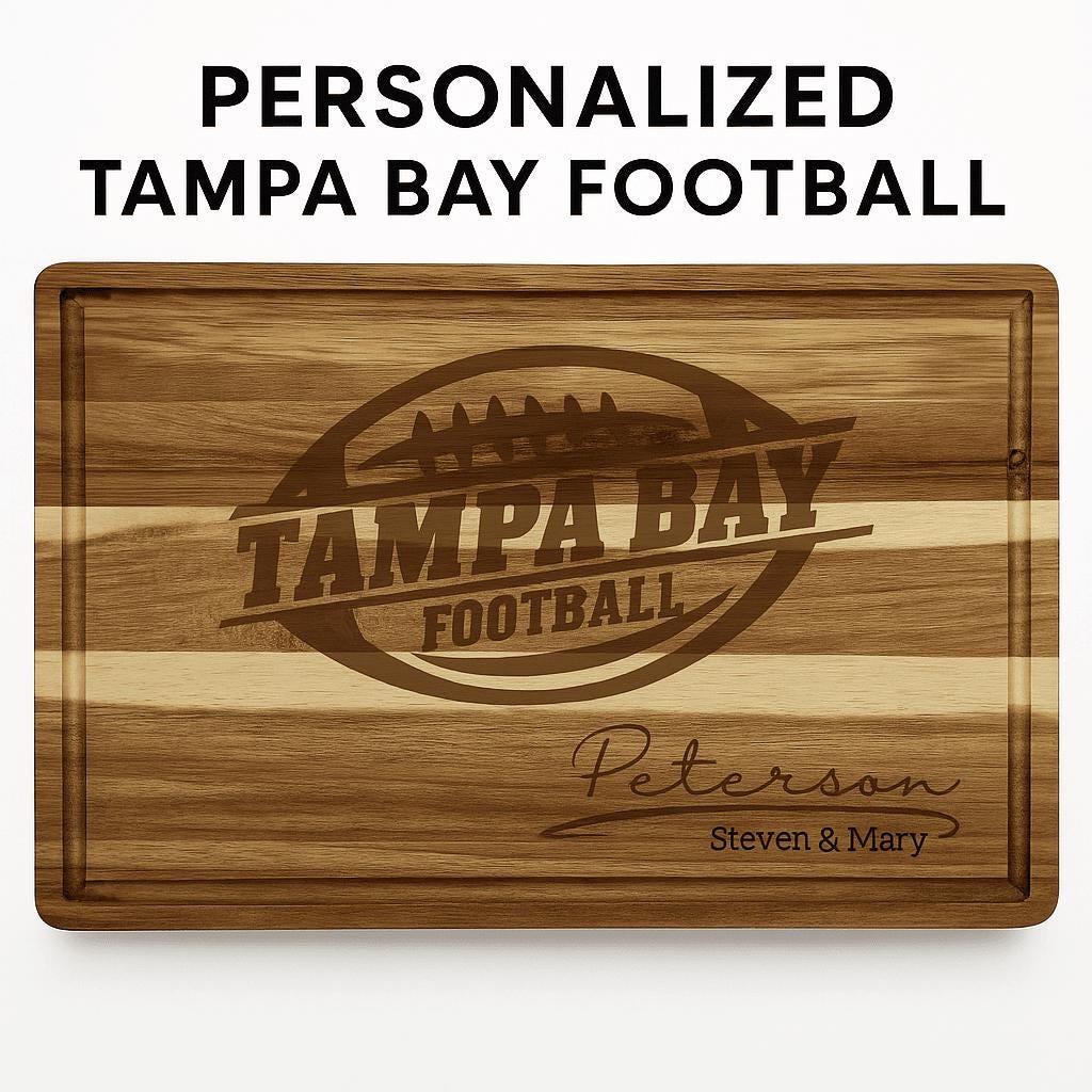 Looking for the perfect gift for a Tampa Bay football fan? Or a show-stopping centerpiece for game day, tailgating, or your Super Bowl party? This custom laser-engraved solid acacia cutting board hits every mark—functional, stylish, durable, and personalized just for you. Hand-crafted from sustainable acacia wood, each board is naturally unique with rich grain patterns. Your engraving is burned deep into the wood for a crisp, long-lasting design that will never peel, fade, or wash off.