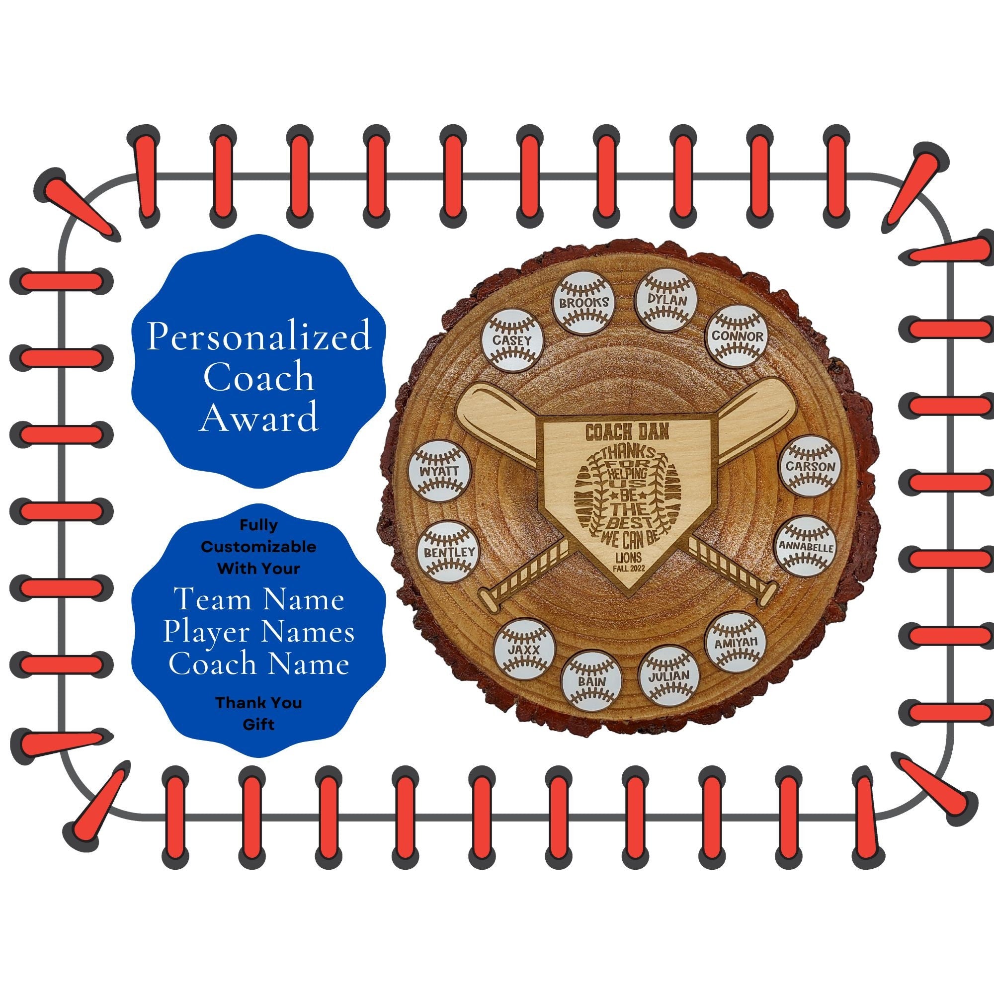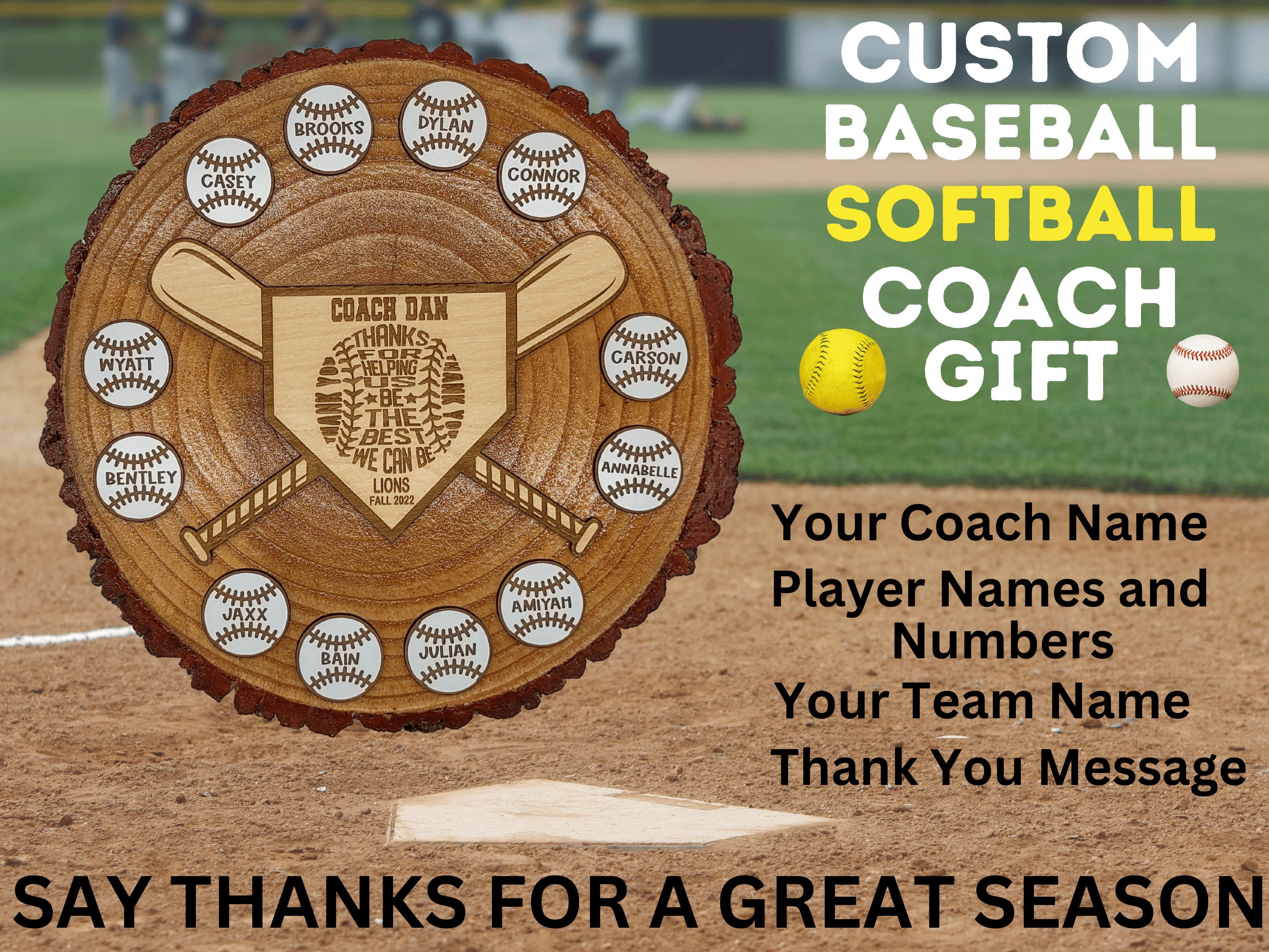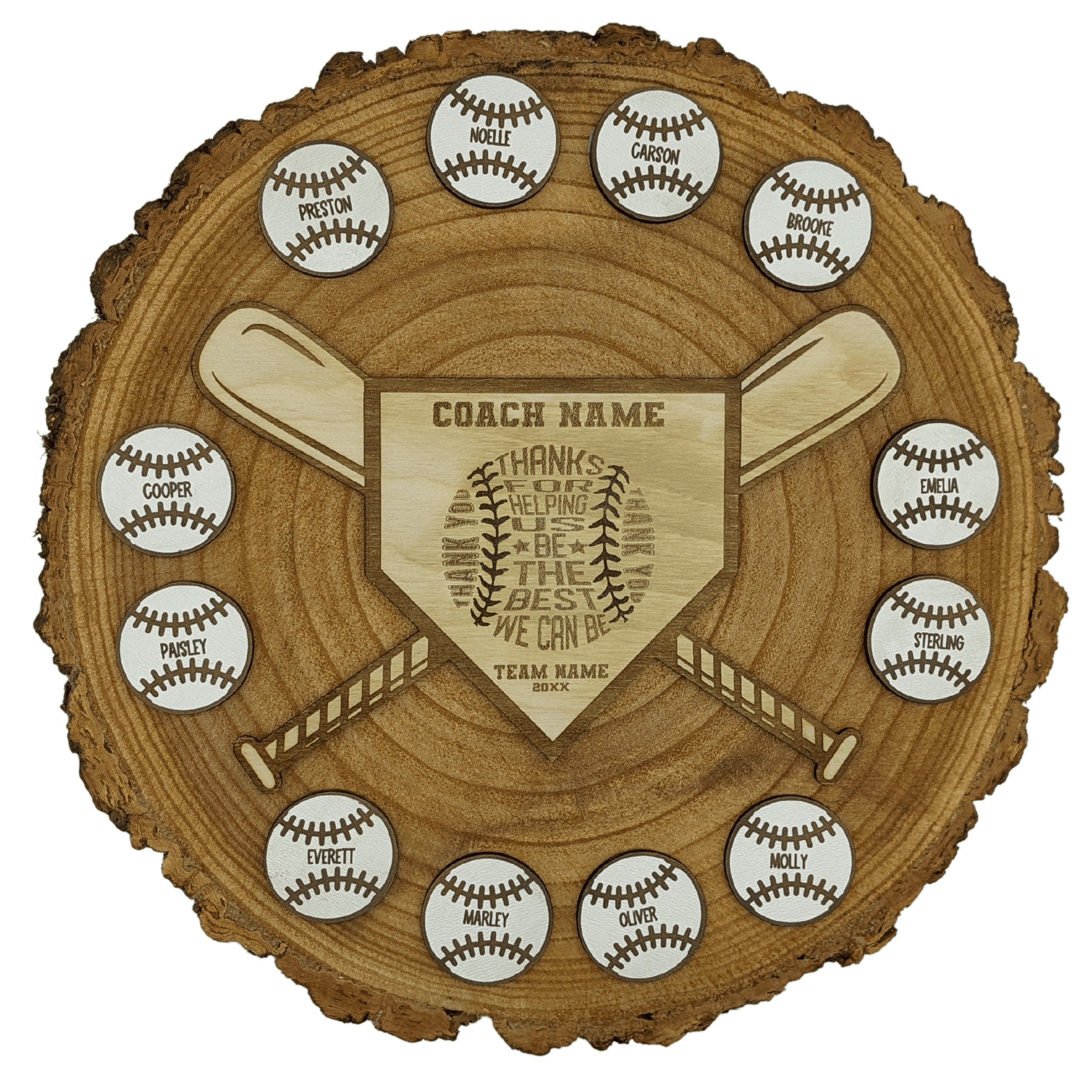 Celebrate a fantastic season and show your gratitude to that remarkable coach with our Personalized Wooden Baseball or Softball-themed Plaque. This thoughtful gift is the perfect way to say "Thank You" to a coach who has gone above and beyond. Designed with precision and care, this plaque features laser-cut decorative baseballs or softballs, each adorned with a player's name from your team. The centerpiece, shaped like home plate, bears the coach's name, team name, season, and a heartfelt "Thank You" message.