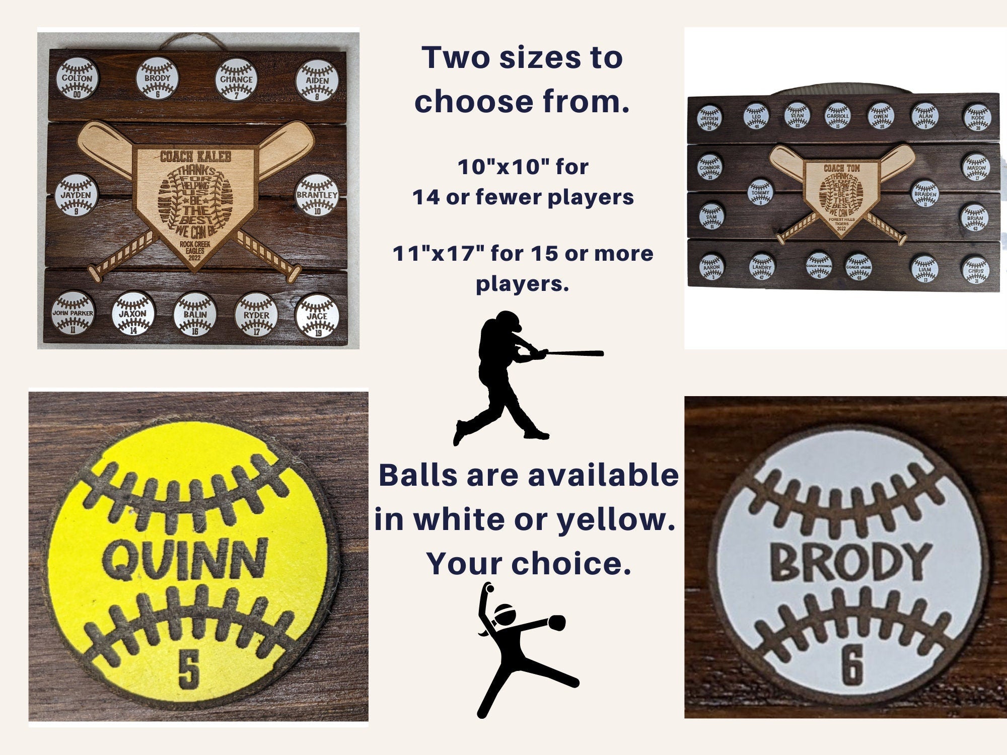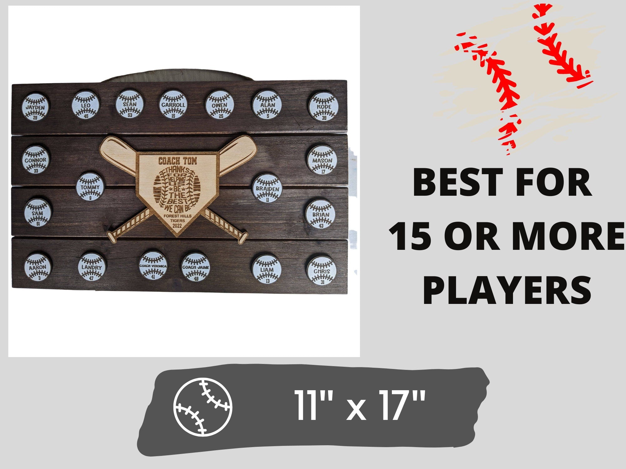 Two Sizes: The regular square sign is approximately 10" in square and 0.75" thick, while the large rectangular sign is approximately 11" by 17" and 0.75" thick, recommended for teams with 15 or more players.