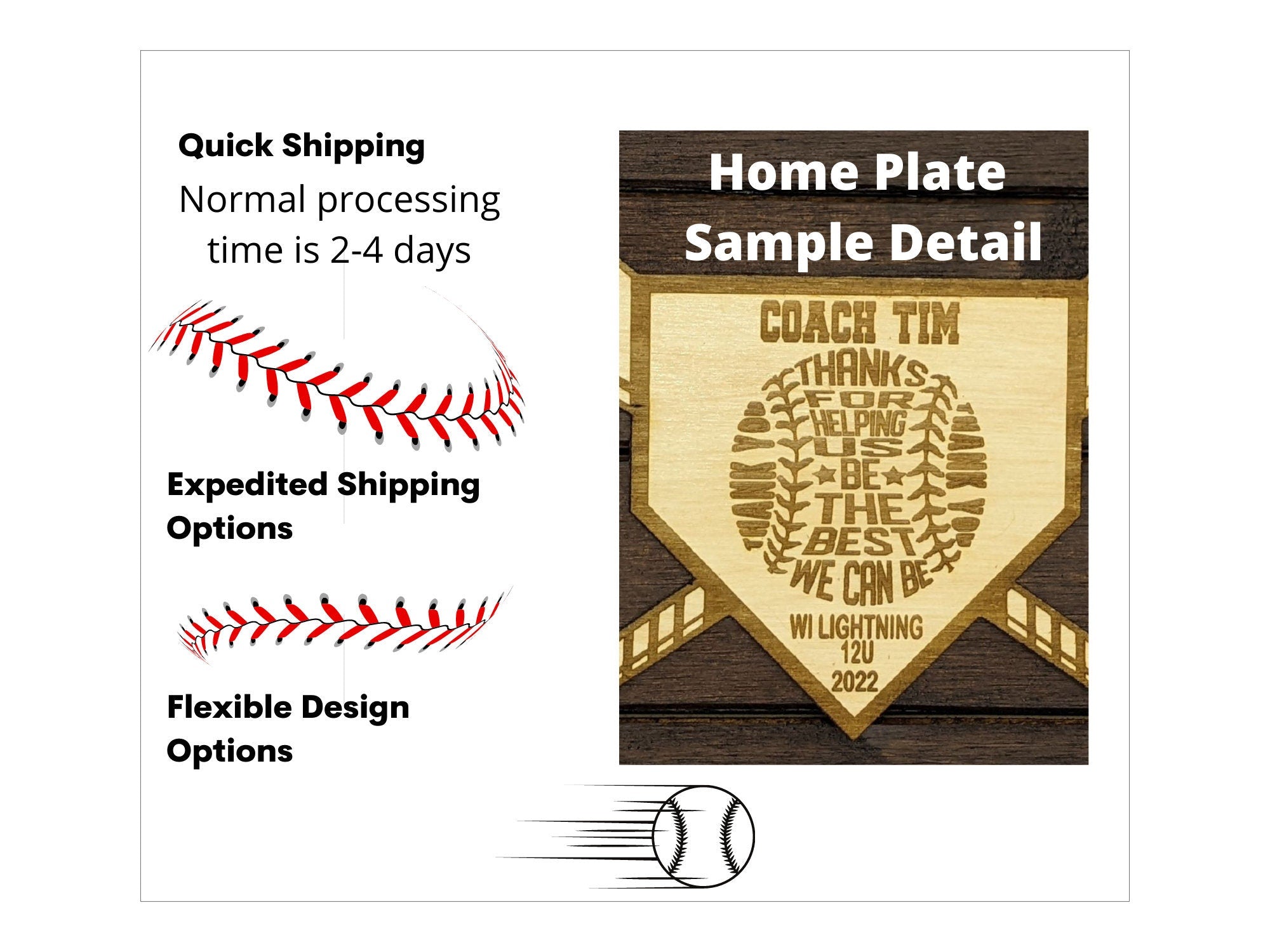 Home Plate Engraving: The home plate is engraved with the coach's name, team name, and season for a personal touch.