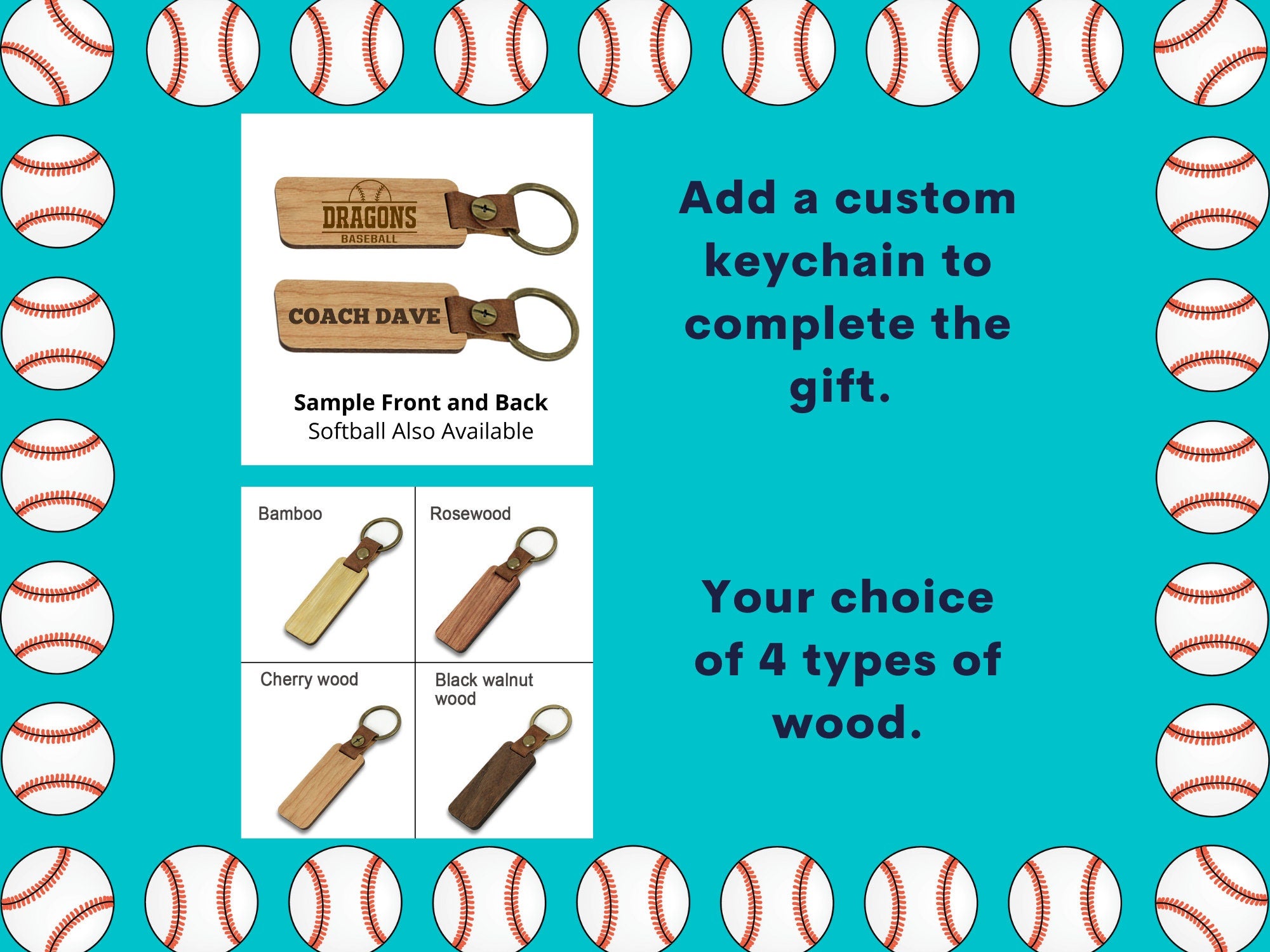 Choice of Keychain: You can choose whether to include a Coaches Personalized Keychain available in 4 different wood types: Cherry, Rosewood, Black Walnut, and Bamboo.