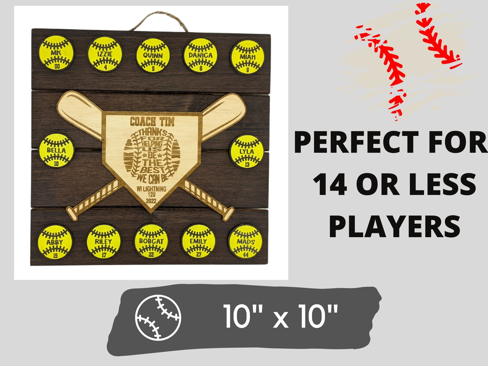 Show your appreciation to that special baseball or softball coach with our Personalized Wooden Coach Award. This custom-made award is a heartfelt way to say "Thank You" and recognize their dedication. The award features laser-cut decorative pieces mounted on a square wooden pallet-style plaque, with each baseball or softball bearing a player's name from your team. The home plate is engraved with the coach's name, team name, and season, making it a truly personal gift. The lightweight design allows for easy mounting on walls or doors, or it can be proudly displayed on a bookshelf. This coach's award is the perfect end-of-the-season gift and now comes in an 11" x 17" version for larger teams with 15 or more players.