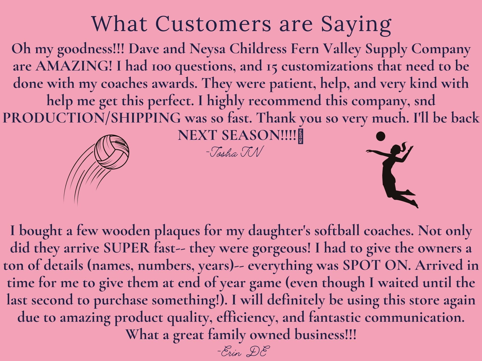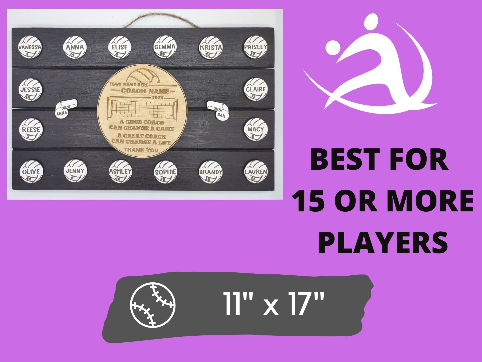 Personalized wooden volleyball-themed plaque to say "Thank You" to that special coach. Laser-cut decorative pieces are mounted on a square or rectangular wooden pallet-style plaque. Each volleyball contains a player's name from your team. The net is engraved with the coach's name, team name, and season. Assistant coach names can be engraved on the optional coach whistles. Light-weight design easily mounts to walls or doors or set on a bookshelf. This coaches award makes a perfect end-of-the-season gift. Now available in a 11" x 17" version for large teams (15 + players). Message us with special requests; we are flexible with our designs.